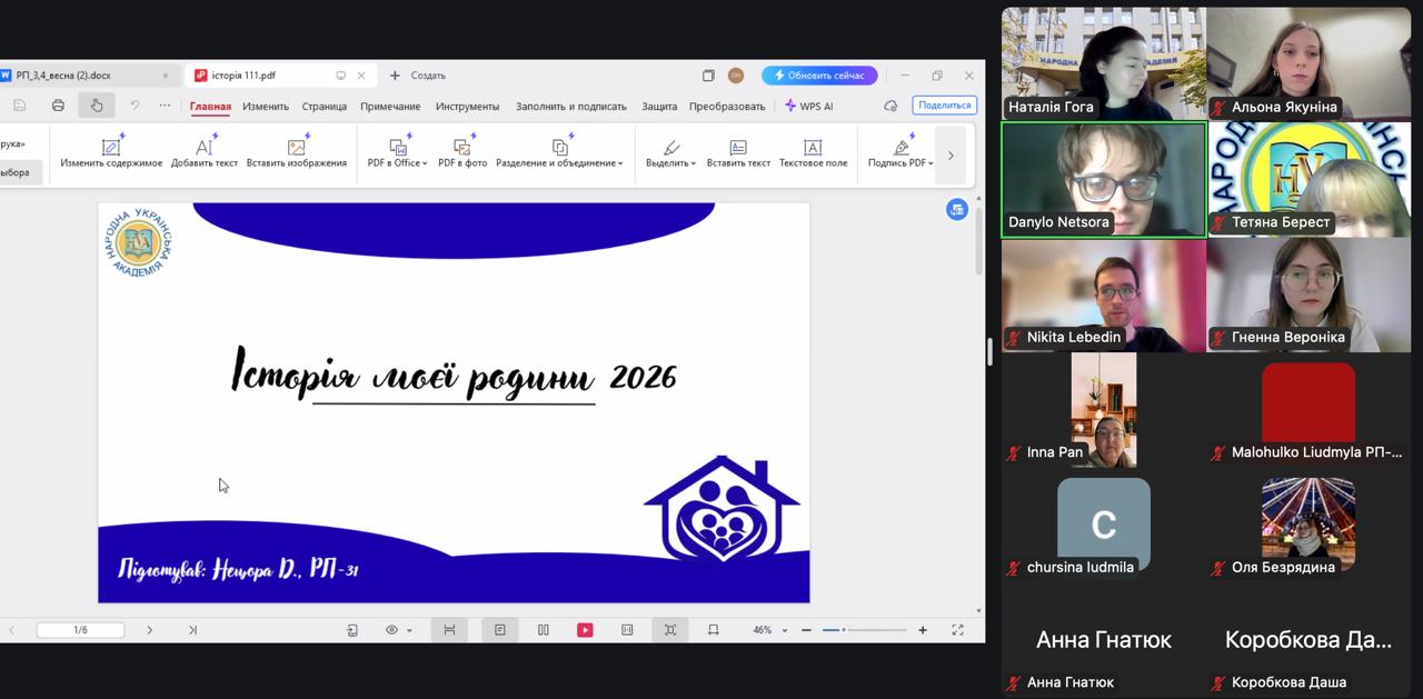 25 лютого пройшла факультетська презентація робіт конкурсу «Історія моєї родини», де було представлено 15 робіт на різноманітні теми: «Генеалогічне дерево», «Служіння вітчизні та обов’язку», «НУА в історії моєї родини», «Традиції в історії моєї родини», «Моя мама» тощо. Важливим стало залученням до пошуків здобувачів 1 курсу.
