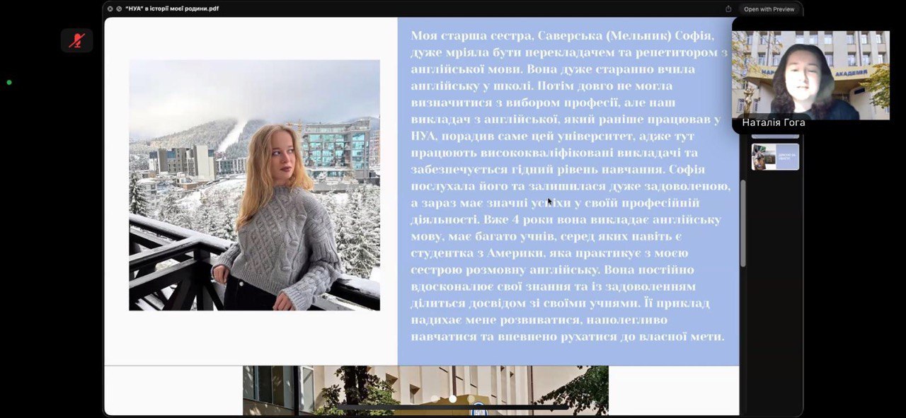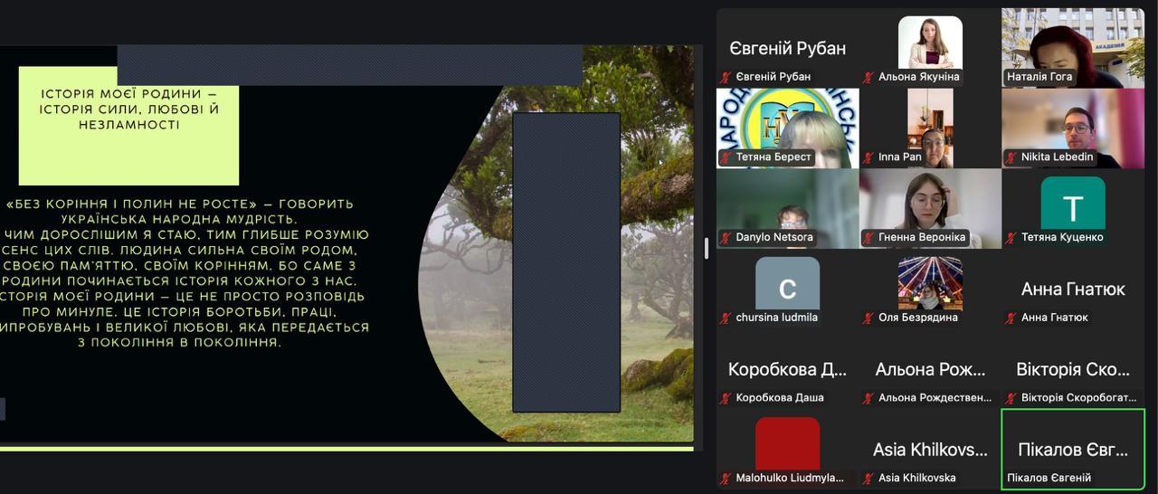 25 лютого пройшла факультетська презентація робіт конкурсу «Історія моєї родини», де було представлено 15 робіт на різноманітні теми: «Генеалогічне дерево», «Служіння вітчизні та обов’язку», «НУА в історії моєї родини», «Традиції в історії моєї родини», «Моя мама» тощо. Важливим стало залученням до пошуків здобувачів 1 курсу.