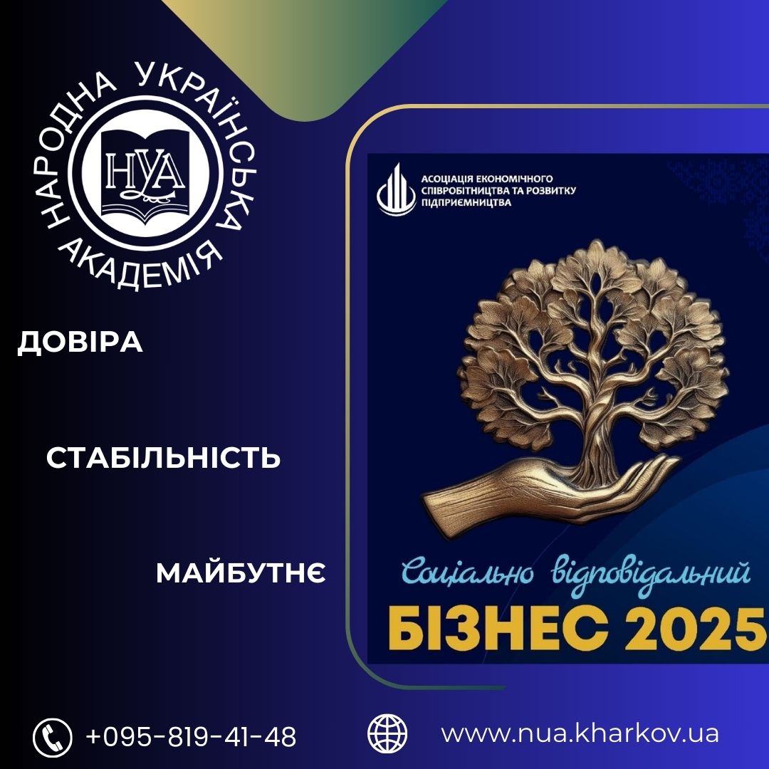 За результатами аналізу фінансово-економічних показників ХГУ «Народна українська академія» відзначено в межах програми «Соціально відповідальний бізнес 2025» за стабільну роботу в умовах війни, підтримку працівників та участь у соціально важливих ініціативах.