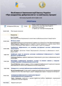 26 березня 2026 року у Харкові відбувся регіональний круглий стіл, присвячений темі «Особливості імплементації Закону України „Про академічну доброчесність“ в освітньому процесі».